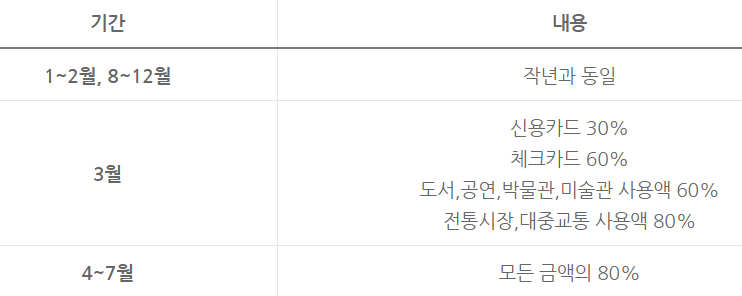 아래 사진에서 보듯이 소득공제율이 확대되었습니다. 코로나19로 인해 경제활동이 어려워진 점을 반영한 사항입니다. 1~2월, 8~12월은 작년과 동일하나, 3월은 신용카드/체크카드 등에서 공제율이 달라졌고, 4~7월은 모든 금애그이 80% 공제율이 적용되도록 변경되었습니다.
